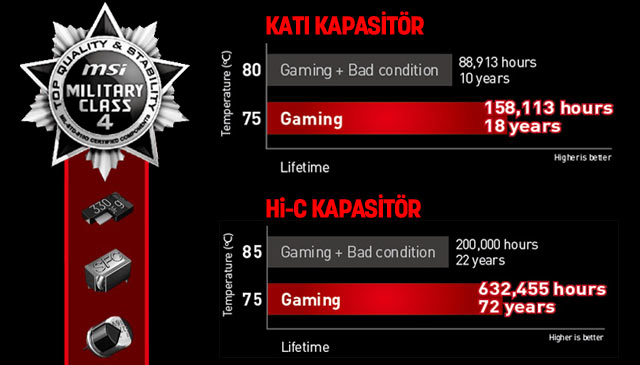 Yüksek malzeme ve üretim kalitesi = yüksek hızaşırtma & uzun ömür. Bu nedenle MSI, GTX770 modelinde en kritik elemanları MIL-STD-810G sertifikasına sahip Military Class 4 kalitesinde üretmiştir. Çünkü sadece bu sayede zorlu işkencelere neden olan extreme oyun ve hızaşırtma durumlarında en iyiler sağ kalabilir. Gelişmiş hızaşırtma yeteneği ile yüksek çalışma frekanslarına ulaşabilirsiniz. CopperMOS, Hi-C kapasitörler, altın SSC ve katı kapasitörlerle en sağlam ve uzun ömürlü grafik kartına sahip olabilirsiniz.