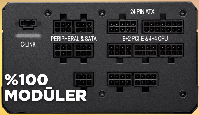 24 pin, 8 pin ve PCI-e bağlantılarının dahi çıkarılabilir olması nedeniyle %100 modüler yapıdaki RM450, bu sayede montaj sırasında kullanıcıya büyük kolaylık sağlar. Daha ferah bir iç hacim, daha iyi hava akımı demektir. Ayrıca bu kablolar geniş ve uzun fulltower kasalar için ekstra uzun yapıdadır. Böylece güç kaynağını aşağıya monte etseniz dahi üstte kalan güç girişlerine kablo yetmeme sorunu kalmaz.