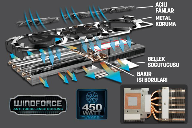 Yeni Windforce 3X soğutma sistemiyle grafik canavarınız emin ellerde. 3 adet ultra sessiz fanla sağlanan güçlü hava akımı altındaki düzinelerce ısı emici yaprak ve bakır ısı borularıyla ince yapıda, ancak tam bir serinletici güce sahiptir. Özel tasarımıyla tam 450W’a kadar soğutma kapasitesi sunar. Sadece grafik çekirdeği değil, bellekler de kendi ısı emicileriyle serinletilerek çalışma frekansı daha da yüksek hızlarda olur.