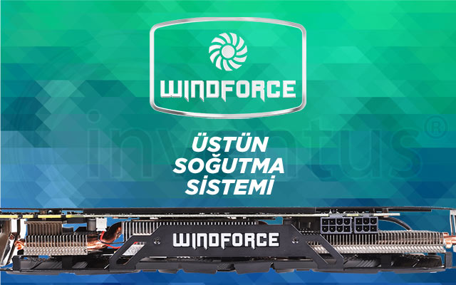 Fabrikadan hızaşırtılmış olarak gelen bu dizginlenemez performans canavarını soğutma görevi gelişmiş Windforce fanlara emanettir. Tam 3 anti-türbülans fandan oluşan bu güçlü sistem, soğutucu yapraklardaki ısıyı en verimli şekilde alarak karttan atılmasını sağlar. Çok sayıdaki fan, sağladığı yüksek hava akımının yanı sıra sessiz çalışarak gerek masaüstünde gerek oyun sırasında sizi rahatsız etmez. Hızını sıcaklık durumuna göre otomatik ayarlayarak her türlü kullanım durumunda en ideal profilde çalışır.
