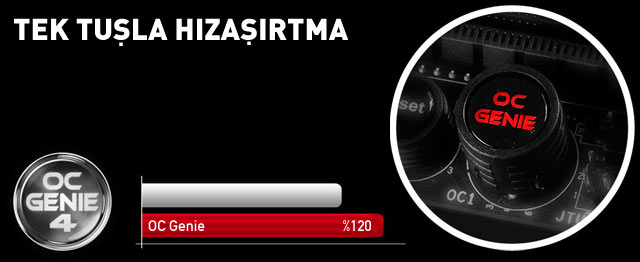 OC Genie, anakartlarda dünyanın ilk tümleşik donanımsal hızaşırtma teknolojisidir. Bir saniyede hızaşırtma olanağı tanıyan bu özellik, size daha da fazla performans sunar. Düğmeye bastığınızda PC'niz adrenalin yüklenmişçesine hızlanır ve CPU, bellek ve iGPU için %20'ye varan performans artışı sağlar.