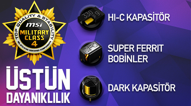 Military Class 4, gelecek nesil yüksek kaliteli bileşenlerdir. DrMOS II, Hi-c CAP, SFC ve Solid CAPS ile PC'nizin en zorlu oyun koşullarında bile kararlı çalışmasını sağlar.