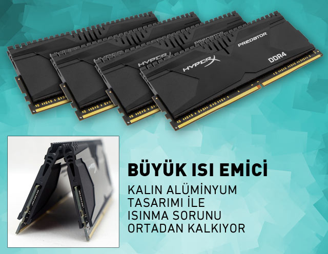 Predator serisi bellekler, sahip olduğu büyük ısı emicisi ile en iyi soğutma çözümünü beraberinde getirir. Geniş yüzey alanı ve kalın yapısı sayesinde çok yüksek frekanslarda bile ısıdan uzak, tamamen güvenli bir kullanım ortamı sunar.