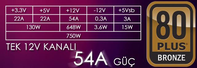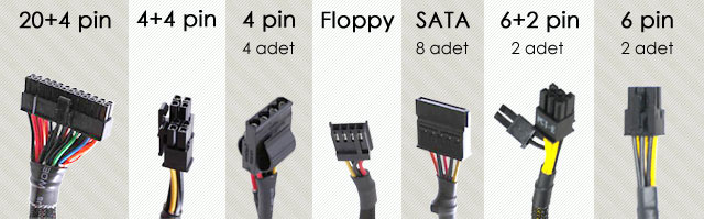 | Güç kaynağı bağlantı kabloları | 1 adet Anakart bağlantısı 24pin ve 1 adet İşlemci güç çıkışı 4+4pin ve 2 adet PCI-E çıkışı 6pin ve 2 adet PCI-E çıkışı 6+2pin ve 4 adet Moleks güç çıkışı ve 8 adet SATA güç çıkışı |