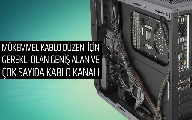 Çok sayıdaki kablo saklama delikleri ile en temiz toplanmış sistemler sizi bekliyor. Böylece dış görüntüsü kadar güzel görünen kablolama sistemine kavuşabilir, hava akımına da engellemeyen bir düzen kurabilirsiniz. Anakart tablasıyla sağ kapak arasındaki geniş aralık yardımıyla düzenleme işlemleri hem hızlı hem de zahmetsiz olur. En kalın kablolar bile rahatlıkla sığar.