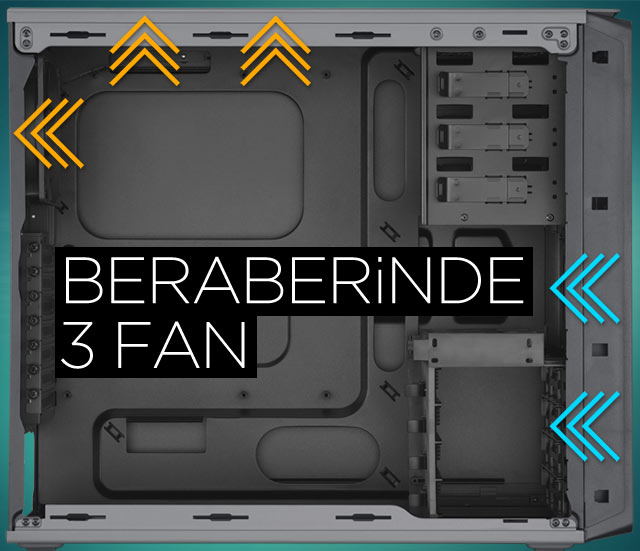 Güçlü soğutma sistemiyle tanışın. Beraberinde gelen 3 adet fanla kasanızda fırtınalar yaratabilir, sıcaklık sorununa kökten çözüm üretebilirsiniz. İdeal dönme hızlarıyla sessizlik ve performans arasında mükemmel bir çizgide görev yaparlar. Her türlü ihtiyaç için en iyi çözümü sunarlar. Dilerseniz opsiyonel yuvalar ile soğutma performansını daha da artırabilirsiniz.