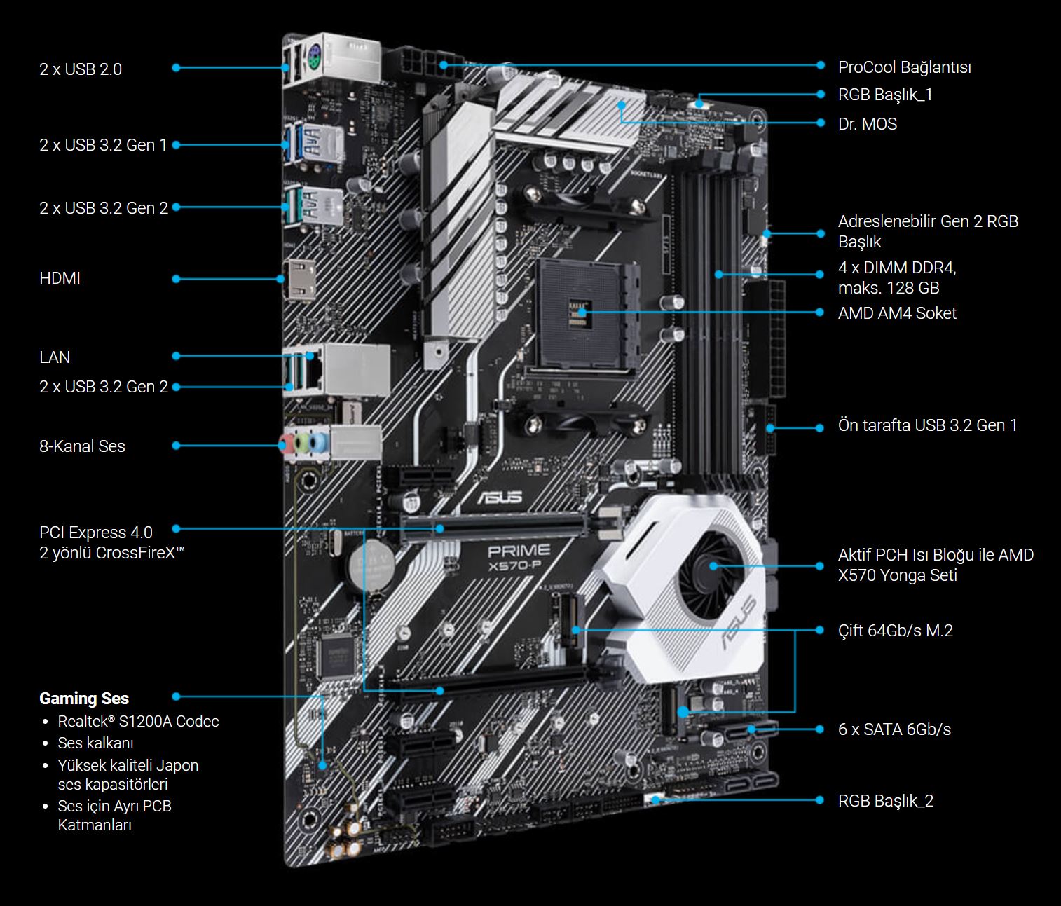 PCIe 4.0, 12 güç aşamalı DrMOS, DDR4 4400MHz, çift M.2, HDMI, SATA 6Gb/s, USB 3.2 Gen 2 ve Aura Sync RGB başlıklı AMD AM4 ATX anakart