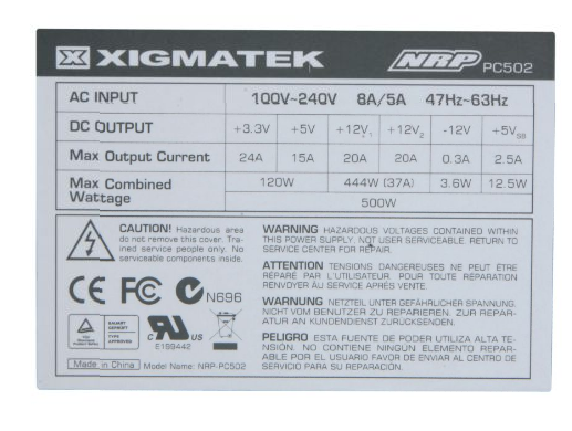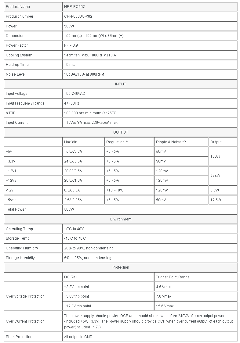 | Güç kaynağı | ATX12V / EPS12V, 500W, 140mm,  Active PFC |