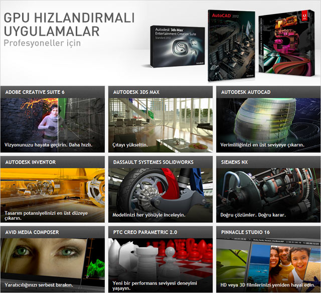 Özellikle profesyonel iş istasyonları için tasarlanan ve geliştirilen NVIDIA Quadro GPU’lar üretim, medya ve eğlence, bilimler ve enerji dahil olmak üzere geniş bir aralıktaki sektörlerde 150’den fazla profesyonel uygulamayı güçlendirmektedir. Profesyoneller Adobe CS6, Avid Media Composer, Autodesk Inventor, Dassault Systemes CATIA ve SolidWorks, Siemens NX, PTC Creo ve diğer bir çok uygulamada mümkün olan en iyi deneyimi sunmak üzere onlara güveniyorlar.