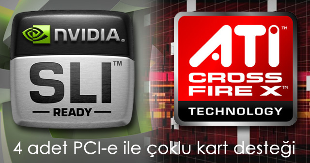 Bol bağlantı seçeneği ile tüm donanımlarınız güce kavuşacak. Buna tam 4 adet PCI-e ekran kartı çıkışı da dahil. Nvidia SLI ve AMD CrossFireX ile kurulmuş sistemler için sayısı artırılan bu çıkışlar, grafik kartlarının ihtiyacı olan yüksek güç ve akım değerlerine hiç bir kayıp olmadan ulaşmalarını sağlar. Böylece yüksek kalitede oyun keyfini stabil olarak güven içinde yaşayabilirsiniz.