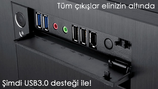 Her an elinizin altındaki ön panel bağlantı seçenekleri ile kolay iletişim olanaklarına kavuşacaksınız. Kullanmadığınız zaman kapağını kapatarak görsel bütünlüğü de bozmazsınız.