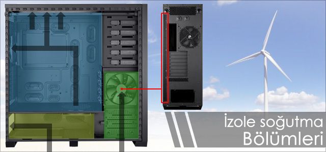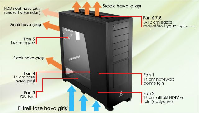 Basit ama etkili; ısınan hava yükselir. Corsair 800D tam olarak bu mantığa sağdık kalınarak hava akımı yaratır. Alt kısımdan alınan taze serin hava ısınan bileşenlerden geçerek üst ve arka taraftan kasa dışına atılır. Hal-i hazırda sahip olduğu üç adet 14 cm’lik fana ilaveten dört adet 12 cm daha takılma imkanına sahiptir. Böylece etkili hava akımı en üst düzeye çıkarılabilir. Altta bulunan ve kolayca demonte edilen toz filtresi ile istenmeyen kirliliğin önüne geçilir.