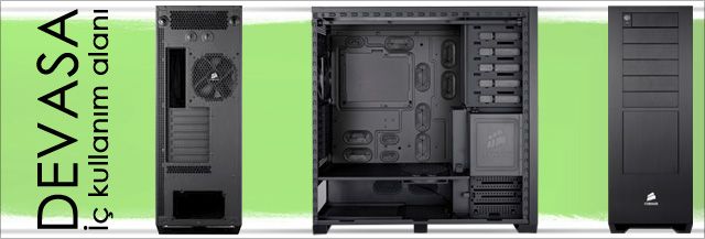Corsair 800D kullanıcıya sunduğu alanı en verimli şekilde kullanan fulltower bir kasadır. İçine monte edeceğiniz her türlü donanıma hazırlıklıdır. En uzun ekran kartları dahi bir problem teşkil etmez. Geniş çalışma alanı sayesinde montaj işlemi sırasında rahatça hareket edebilirsiniz. Birbirlerinden izole edilmiş alanları sayesinde hiç bir donanım bir diğerini rahatsız etmez. Sisteminiz ferah bir nefes alır.