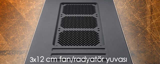 Üst kısımda yer alan opsiyonel üç adet 12 cm’lik fan yuvası hem hava hem de sıvı soğutma severler için harika bir seçenek oluşturur. Dilerseniz daha hızlı egzoz görevi, dilerseniz 12, 24 ya da 36 cm’lik radyatörünüz için yuva görevi görür.