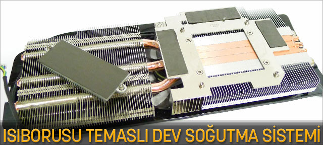 Dev soğutucu, düzinelerce alüminyum yaprak ve 3 adet kalın bakır ısıborusuna sahiptir. GPU’ya direkt ısıemici teması ile en iyi iletim sağlanır. Arada tampon görevinde başka bir taban olmadığı için iletimde kayıp meydana gelmez. Sadece GPU değil bellekler ve voltaj elemanları da kendi ısıemicilerine sahiptir. Böylece Windforce fanlardan gelen hava akımından çok daha verimli faydalanırlar.