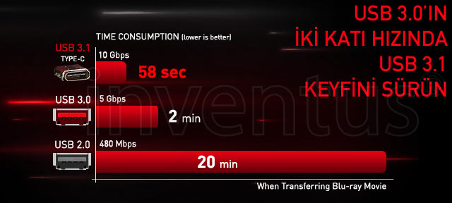 10 Gb/sn'ye ulaşan transfer hızıyla USB 3.1, önceki USB3.0'a göre 2 kat, USB2.0'a göre ise 20 kat daha hızlı veri aktarımı yapar. USB 3.1, SATAIII arayüzünden bile daha hızlıdır. En sevdiğiniz oyunları, videoları ve müzikleri aktarmak hiç bu kadar çabuk olmamıştı.